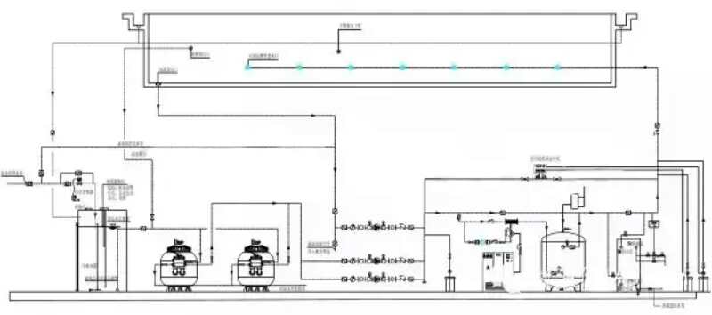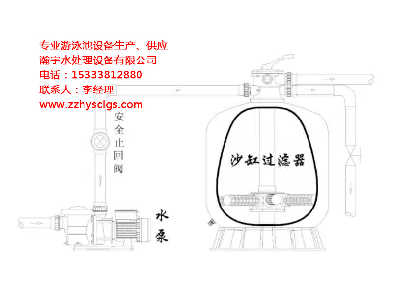 在常規(guī)情況下,水泵等各種設(shè)備靠近游泳池,層高約為5米時(shí),可以采用壓力過濾系統(tǒng),水泵應(yīng)選擇低揚(yáng)程大流量水泵,按標(biāo)準(zhǔn)設(shè)計(jì)的管道和選用的砂缸,不會(huì)因?yàn)殚_泵停泵所產(chǎn)生的水錘破壞砂缸等設(shè)備和管閥。