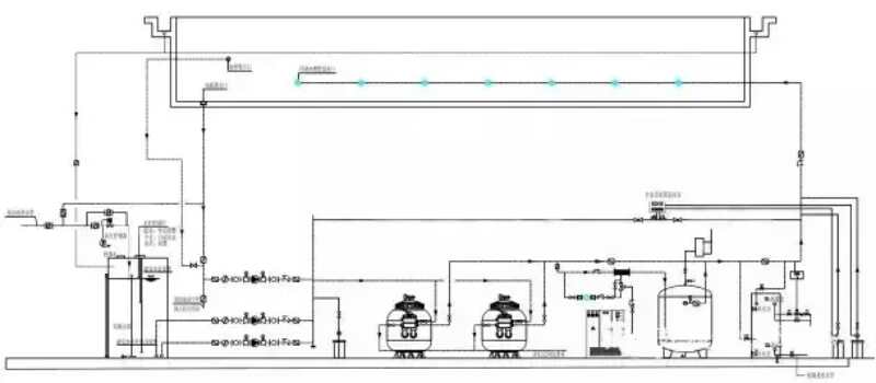 有一高檔酒店,如果游泳池與機(jī)房的落差只有一個(gè)層高(約5米),可以采用上圖所示的循環(huán)過濾系統(tǒng),當(dāng)然可以把池壁給水改成池底給水,這就變成標(biāo)準(zhǔn)的逆流式循環(huán)方式。而在實(shí)際工程中,當(dāng)有時(shí)做成池底給水有困難或做不到時(shí),就可采用球型縮口的池壁給水,也會(huì)具有很好的過濾效果和水質(zhì)。當(dāng)然均衡水箱也可以做在泳池旁邊與池體等高。