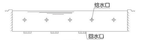 混流式水循環(huán)方式是指泳池的全部循環(huán)水,75%~80%水量經(jīng)由設(shè)在池壁外側(cè)的溢流回水口取回;另外20%~25%的水量從在池底的回水口取回。此兩部分循環(huán)水量合并進(jìn)行水處理系統(tǒng)后,經(jīng)設(shè)在游泳池底的給水口送入游泳池內(nèi)繼續(xù)使用的水流組織方式。