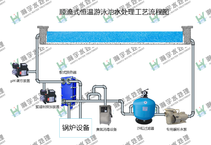 上面詳細(xì)講述了泳池水的循環(huán)方式,關(guān)于泳池水的過(guò)濾可以采用沙缸過(guò)濾,整個(gè)游泳池循環(huán)過(guò)濾流程圖如上圖所示,以上內(nèi)容由鄭州瀚宇水處理設(shè)備有限公司提供。