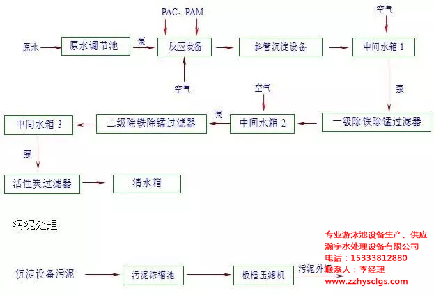 原水進(jìn)入調(diào)節(jié)池,調(diào)節(jié)原水的水量和水質(zhì),為防止懸浮物在調(diào)節(jié)池內(nèi)沉淀,在調(diào)節(jié)池底布有穿孔曝氣管,采用間隙曝氣。調(diào)節(jié)池提升泵將原水提升至反應(yīng)設(shè)備,在反應(yīng)設(shè)備內(nèi)投加PAC和PAM,通過空氣攪拌使原水充分混合后流入斜管沉淀設(shè)備,去除水中的懸浮物。沉淀設(shè)備出水流入中間水箱1,利用鼓風(fēng)機(jī)對(duì)中間水箱1充氧,一方面對(duì)水中進(jìn)行充氧,使水中的含氧量提高。另一方面可散除水中的二氧化碳,提高水中的PH值,有利用對(duì)鐵錳的去除,因?yàn)樗腜H值越高,越有利于反應(yīng)向鐵錳的氧化方向進(jìn)行。再由中間水泵1加壓抽至一級(jí)除鐵除錳過濾器去除絕大部分鐵錳后流入中間水箱2,同時(shí)向中間水箱2中充氧,再由中間水泵2加壓抽至二級(jí)除鐵除錳過濾器,保證水中的鐵錳的含量達(dá)到排放要求。